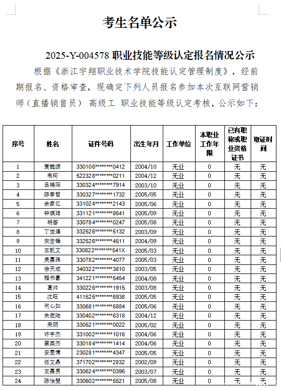互联网营销师(直播销售员)高级工职业技能等级认定考生名单公示